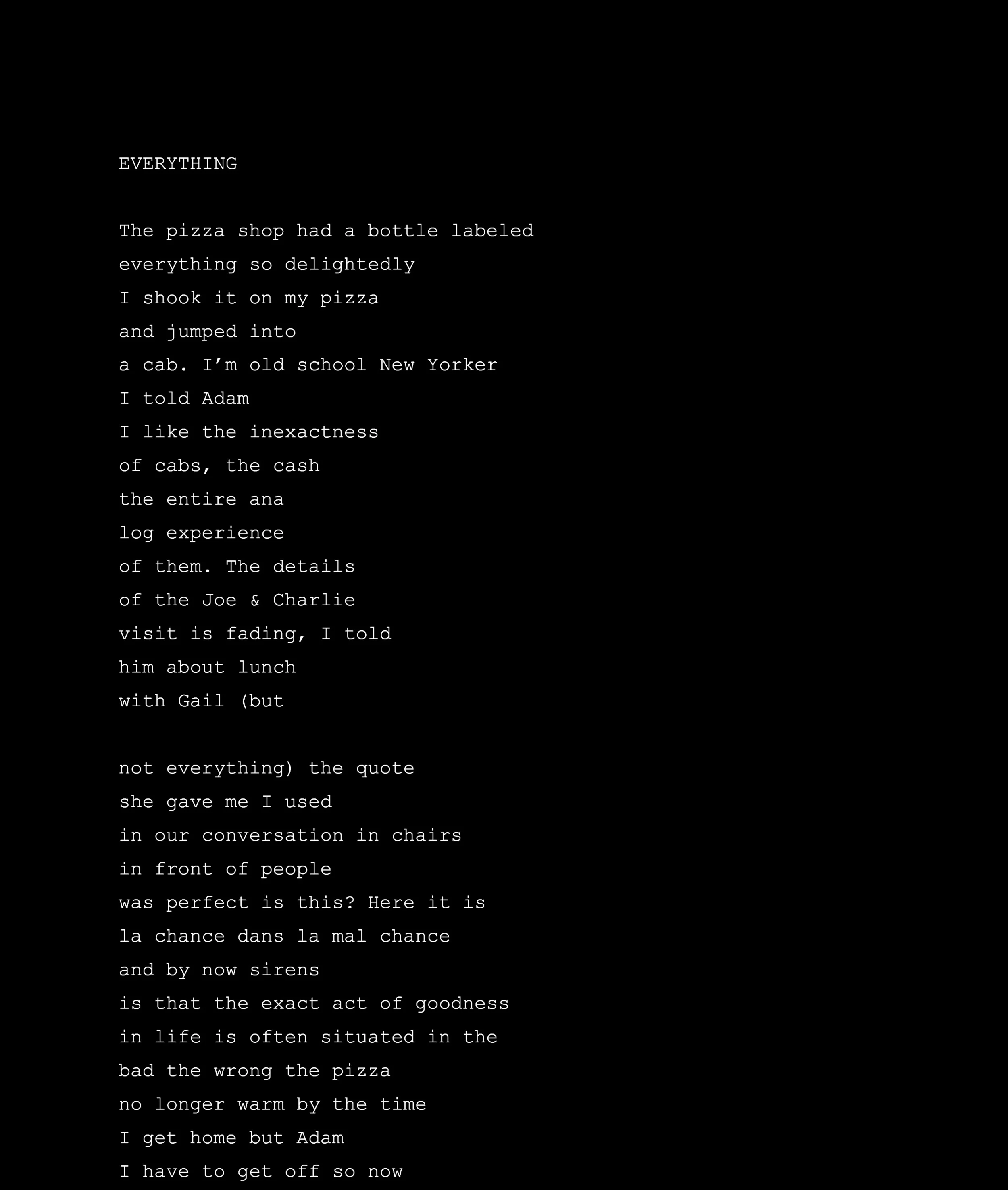 Eileen Myles came to New York from Boston in 1974 to be a poet, subsequently a novelist, public talker and art journalist. A Sagittarius, their twenty books include evolution (poems), Afterglow (a dog memoir), a 2017 re-issue of Cool for You, I Must Be Living Twice/new and selected poems, and Chelsea Girls. Eileen is the recipient of a Guggenheim Fellowship, an Andy Warhol/Creative Capital Arts Writers grant, four Lambda Book Awards, the Shelley Prize from the PSA, and a poetry award from the Foundation for Contemporary Arts. In 2016, Myles received a Creative Capital grant and the Clark Prize for excellence in art writing. In 2019 they'll be teaching at NYU and Naropa University and they live in New York and Marfa, TX.