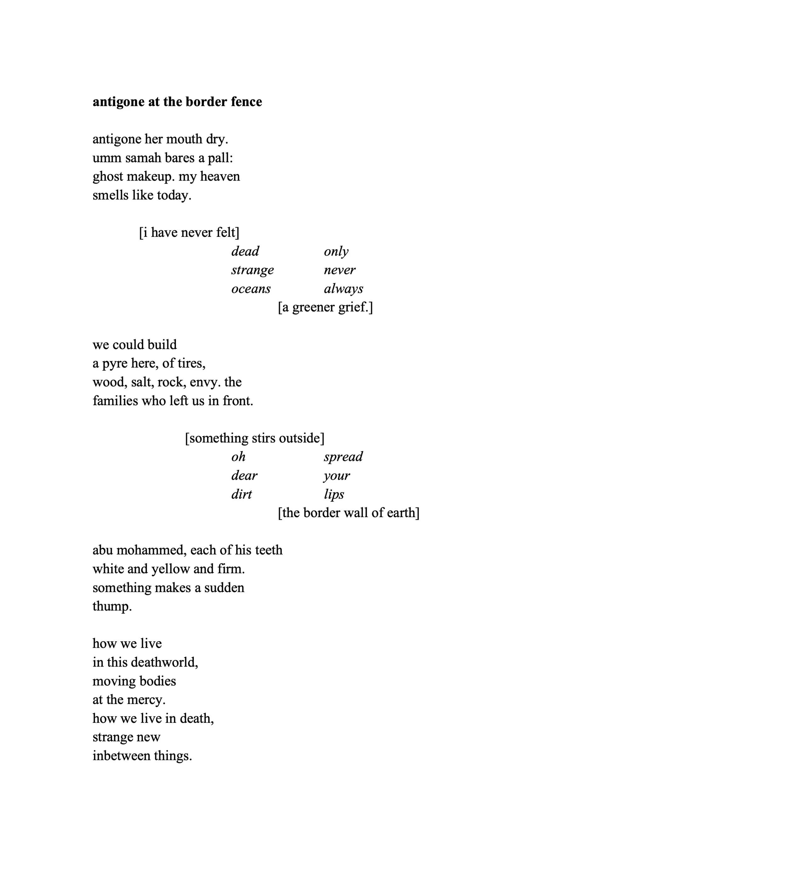 Fargo Tbakhi (he/him) is a queer Palestinian-american writer and performer from Phoenix, Arizona. He is the winner of the 2018 Ghassan Kanafani Resistance Arts Scholarship, a Pushcart nominee, and a 2020 Desert Nights, Rising Stars fellow. His work is published or forthcoming in The Shallow Ends, Cotton Xenomorph, Mizna, Cosmonauts Avenue, Glass: a Journal of Poetry, Peach Mag and elsewhere. He tweets @YouKnowFargo and probably wants to hold your hand.
