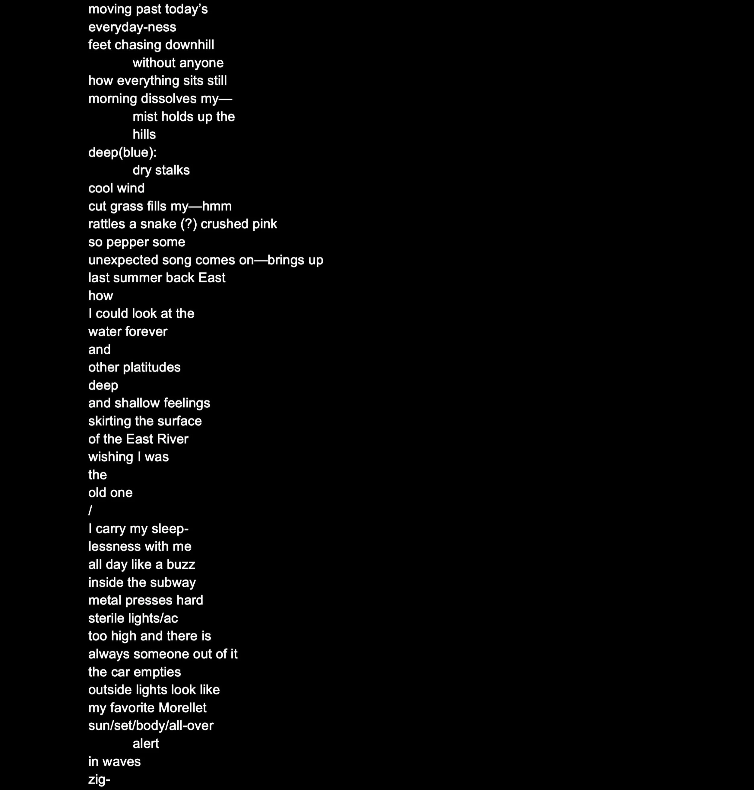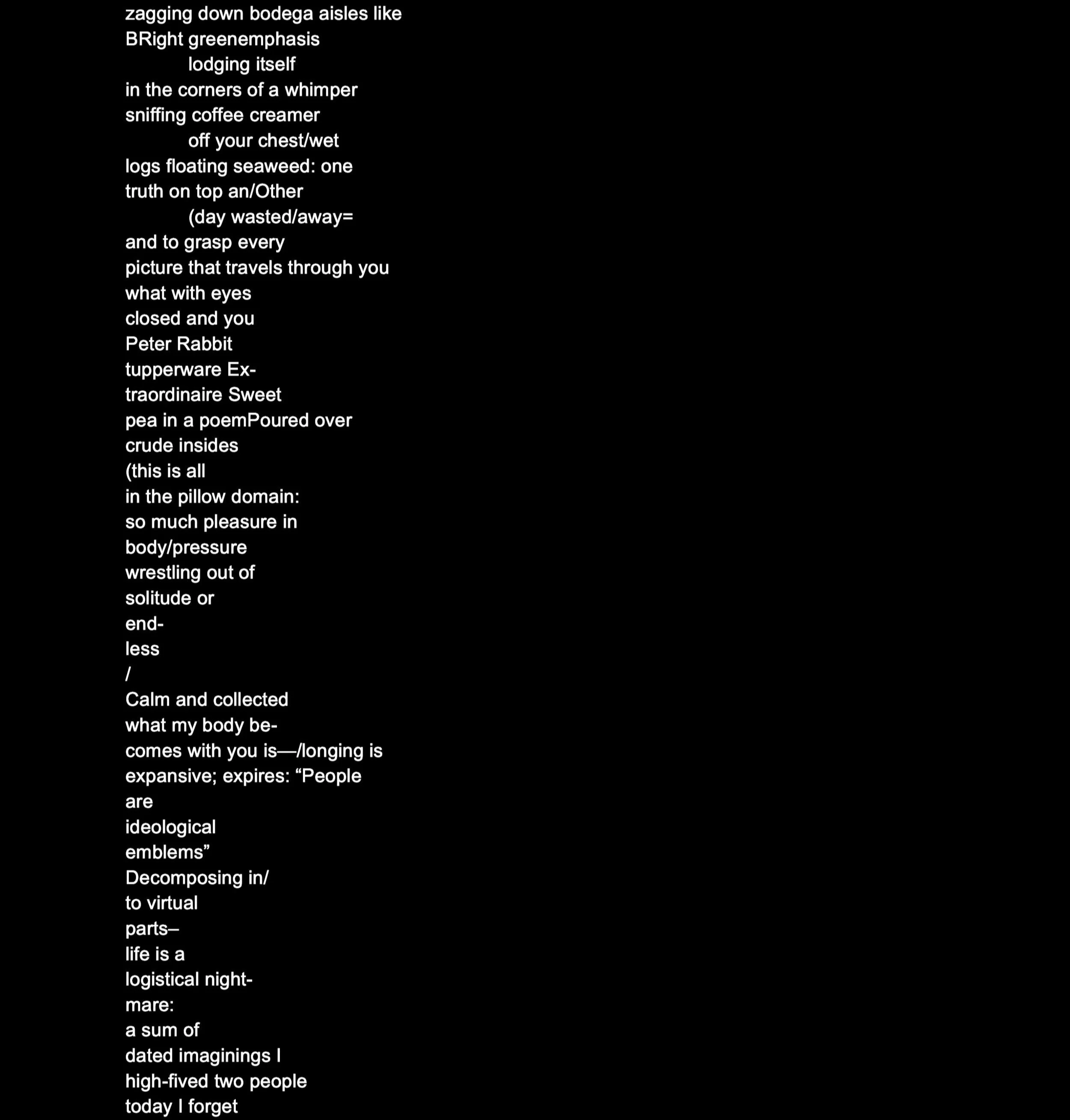 Fía Benitez is an MFA candidate at CalArts School of Art, where they served as feature editor for Sublevel Magazine #4: EDGE. They hold a BA in Media Studies from Vassar College. Their work can also be found in New Writing by California Poets.