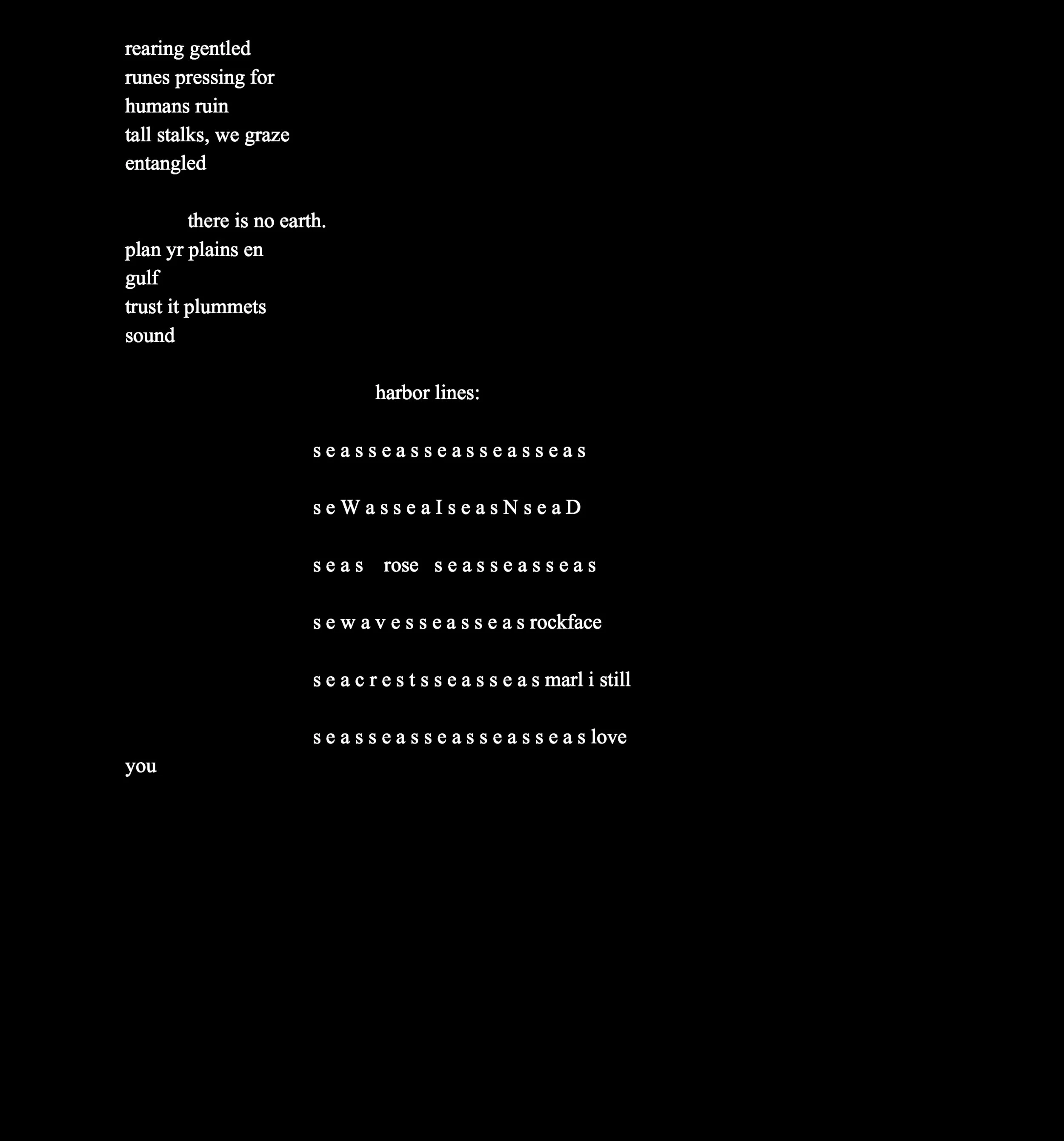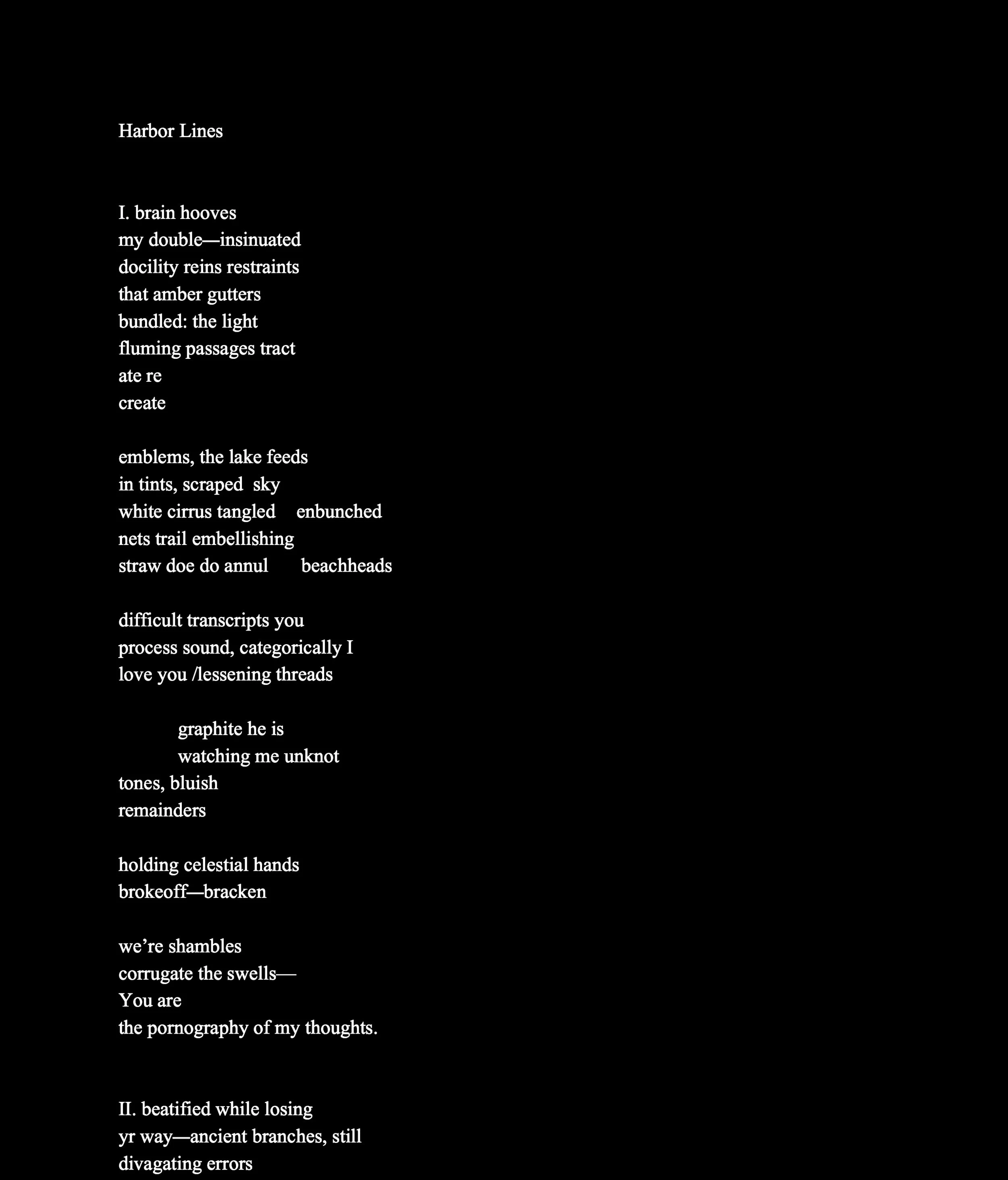 Jessica Baer received their MFA from Brown University in 2017. They have a poetry chapbook with Magic Helicopter Press (Holodeck One, 2017) and have been included in journals such as Prelude Mag, Pinwheel, Bathhouse, Black Sun Lit, and Bone Bouquet. Their manuscript Midwestern Infinity Doctrine was recently shortlisted as a finalist with Tarpaulin Sky press. They also have a forthcoming chapbook of science fiction with Essay Press.