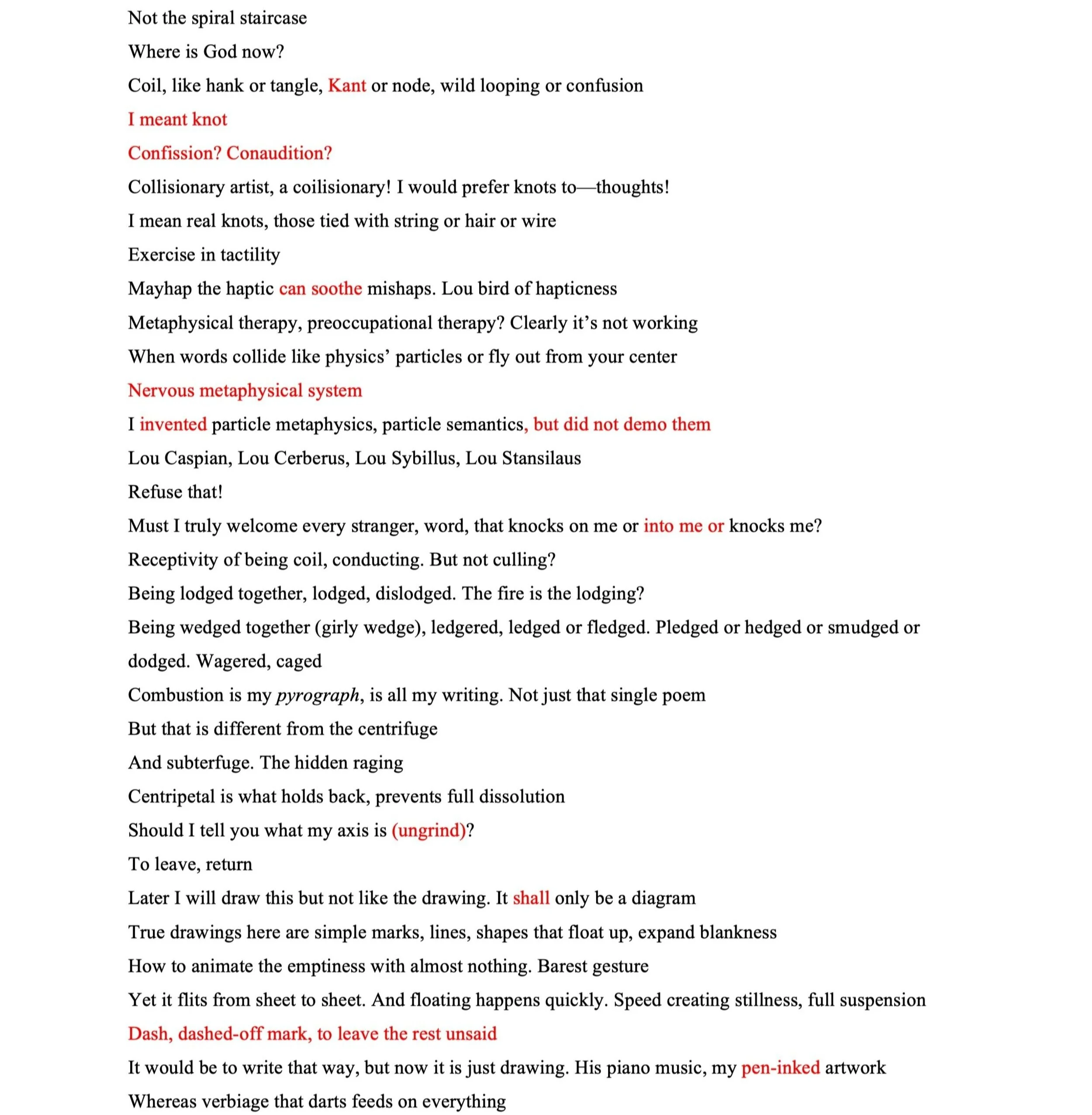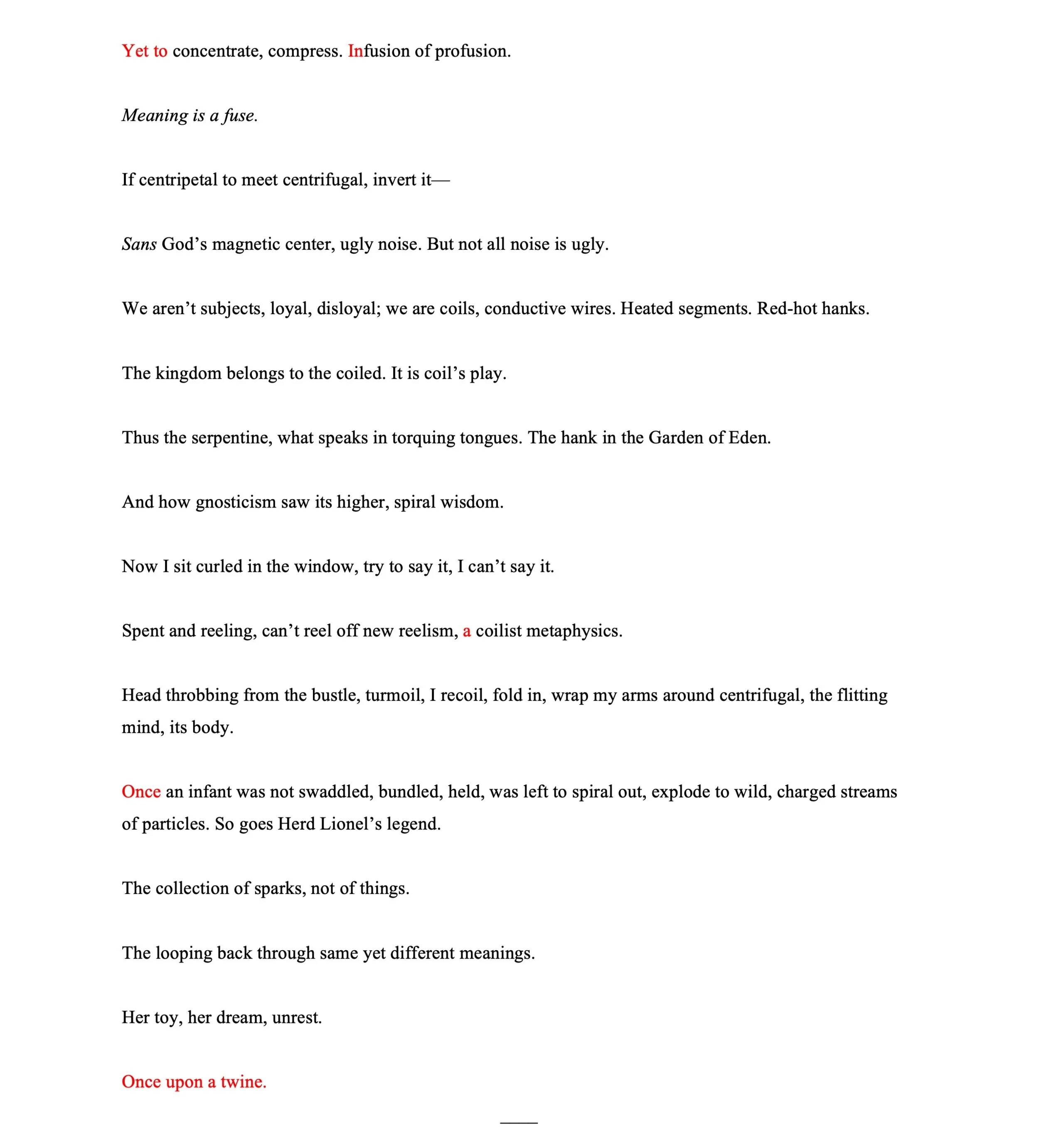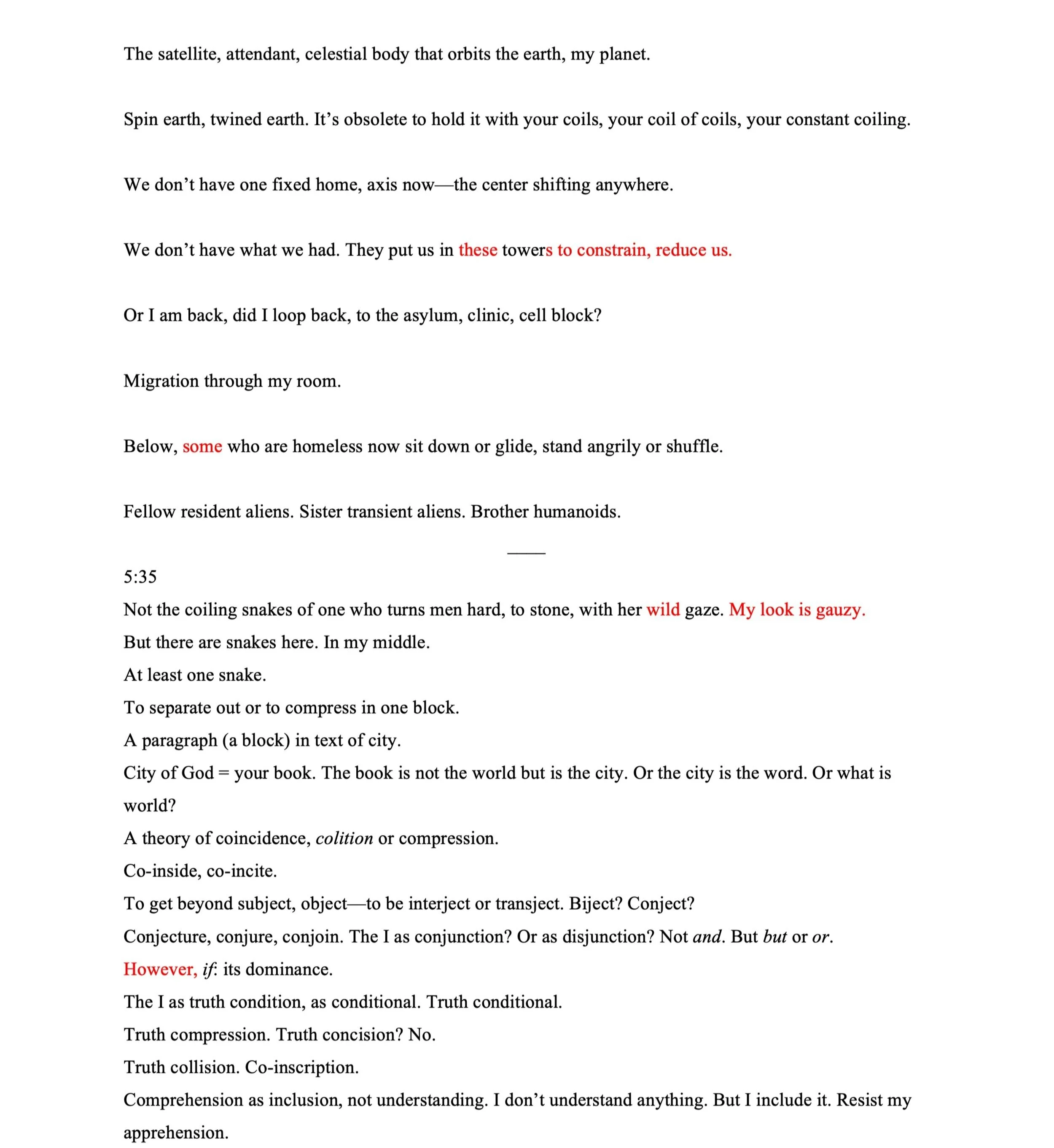 Lou Pam Dick (aka Moina/Misha/Gregoire/Mina Pam Dick et al.) is the author of Moira of Edges, Moira the Tart (OPR, 2019), this is the fugitive (Essay Press, 2016), Metaphysical Licks (Book*hug, 2014) and Delinquent (Futurepoem, 2009). Her book I am writing you from afar is forthcoming from Black Sun Lit in 2021. With Oana Avasilichioaei, she is the co-translator of Suzanne Leblanc’s The Thought House of Philippa (Book*hug, 2015), and her own writing has been misadapted into French by Montreal poet Steve Savage. Also a visual artist and lateral philosopher, Dick lives in New York City.