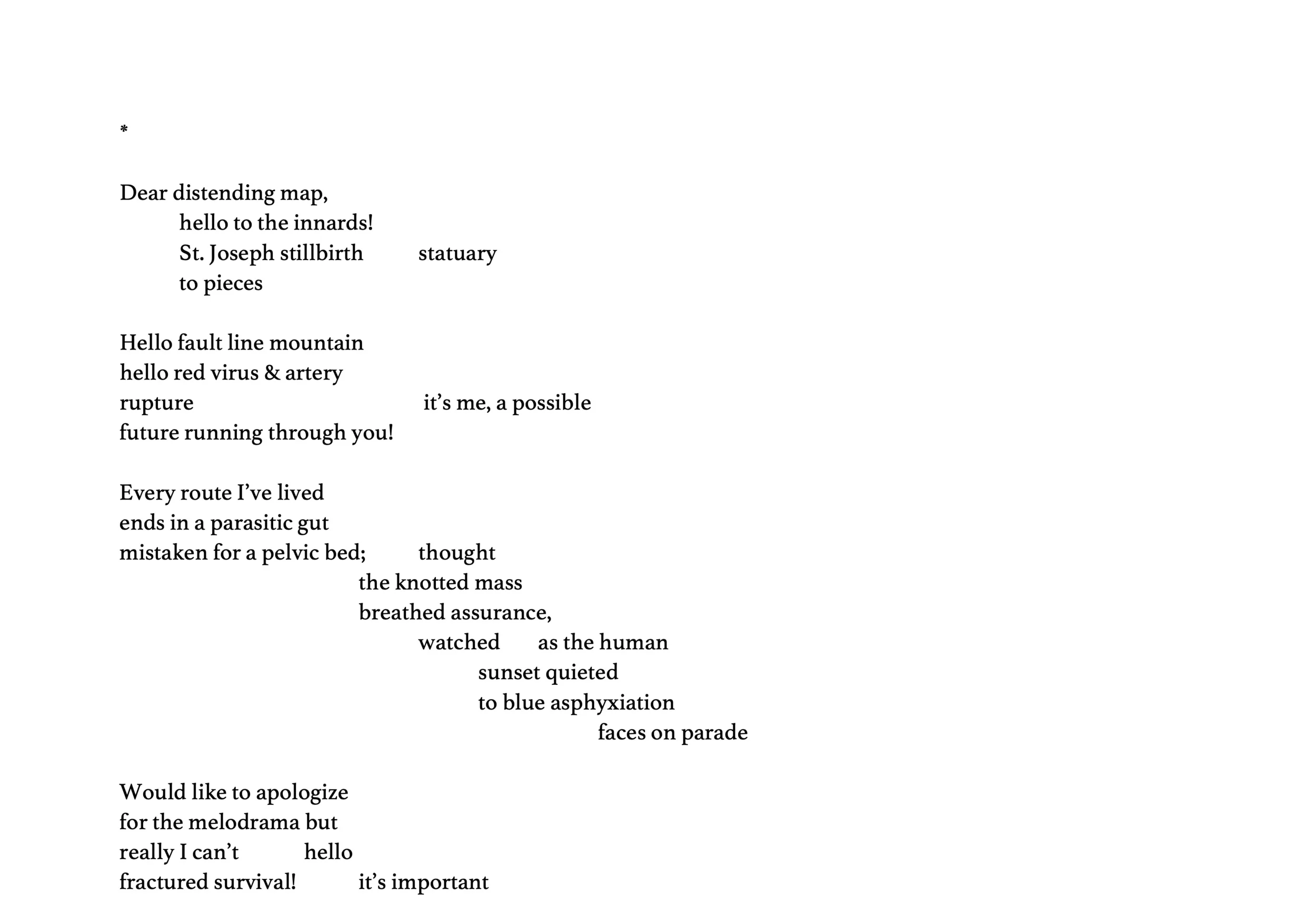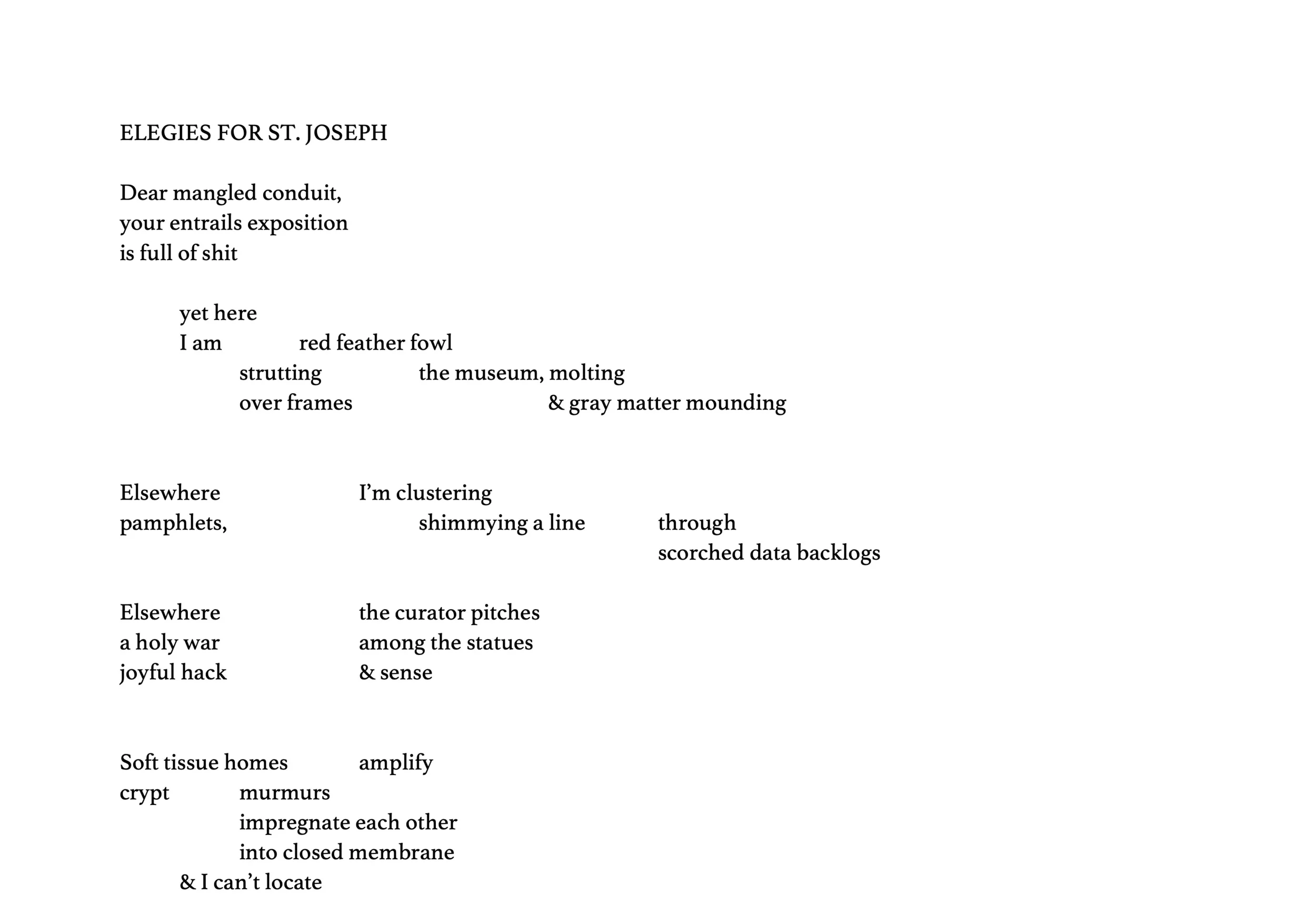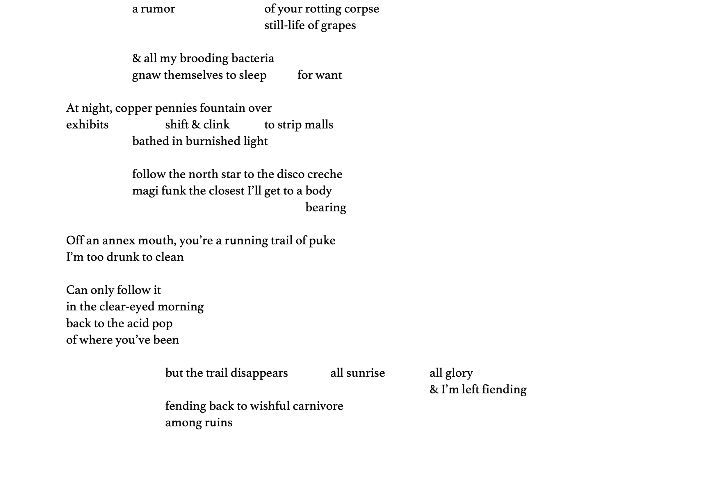 Phil Spotswood is a poet from Alabama. His most recent work can be found in tenderness yea, The Wanderer, and Tagvverk. He is the recipient of the 2018 Robert Penn Warren MFA Poetry Thesis Award judged by Tonya Foster, and the 2017 William Jay Smith MFA Poetry Award judged by Daniel Borzutzky. He is the poetry editor for Cartridge Lit, and tweets @biometrash.
