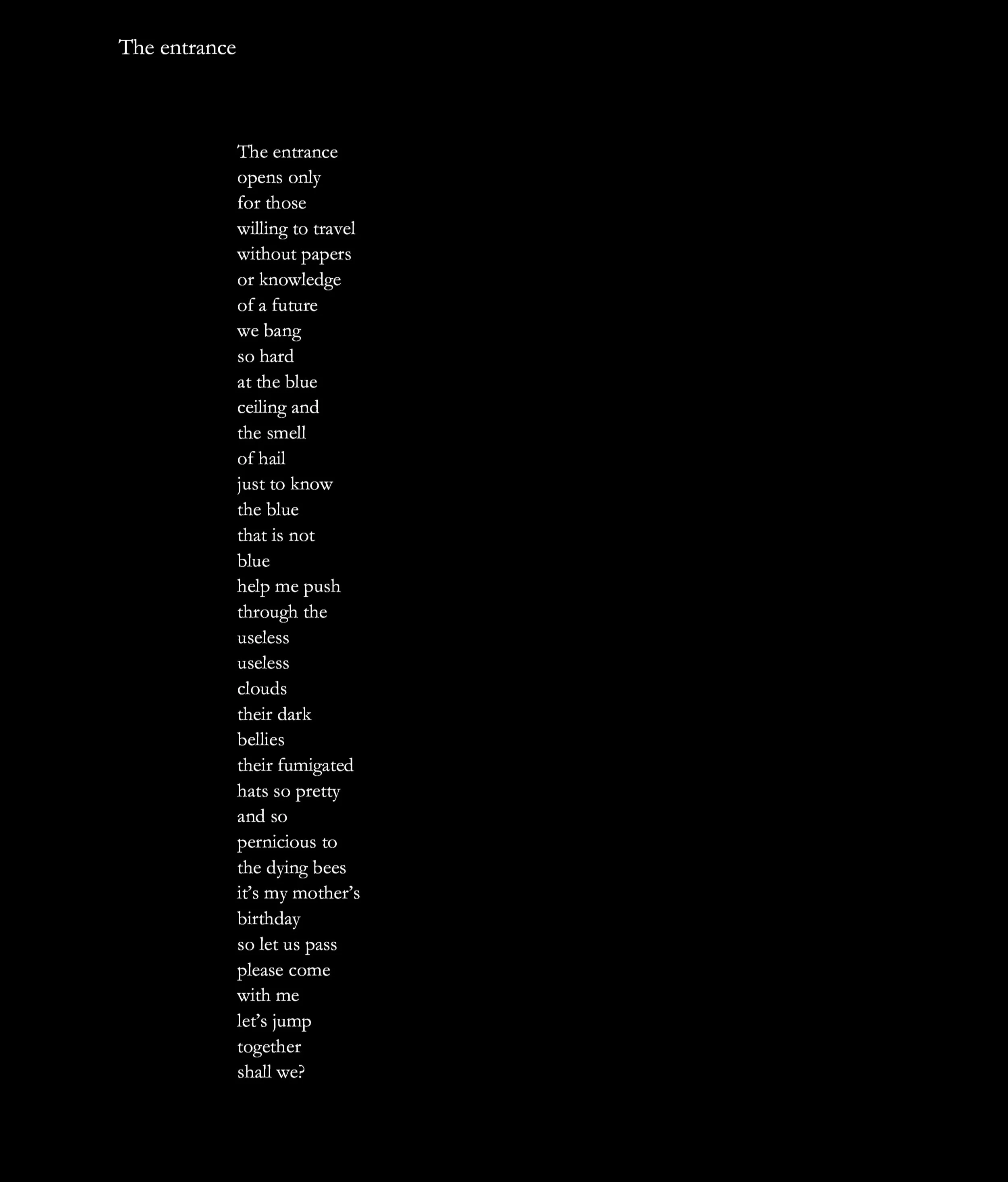 Samuel Ace is a trans/genderqueer poet and sound artist. He is the author of several books, most recently Our Weather Our Sea (Black Radish 2019), the newly re-issued Meet Me There: Normal Sex and Home in three days. Don’t wash., (Belladonna* Germinal Texts 2019), and Stealth with poet Maureen Seaton. He is the recipient of the Astraea Lesbian Writer Award and the Firecracker Alternative Book Award in Poetry, as well as a two-time finalist for both the Lambda Literary Award and the National Poetry Series. His work has been widely anthologized and recent poems can be found in Poetry, PEN America, Best American Experimental Poetry, Vinyl, and many other journals and anthologies. He currently teaches poetry and creative writing at Mount Holyoke College in western Massachusetts. In the summer of 2020, will be teaching poetry for Lambda Literary’s Writers Retreat for Emerging LGBTQ Voices. Listen to Samuel’s sound piece based on “The Entrance” here.